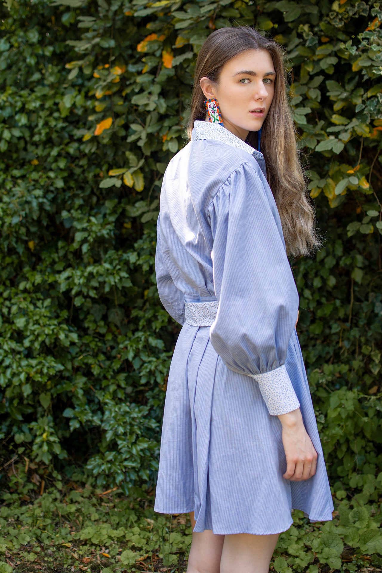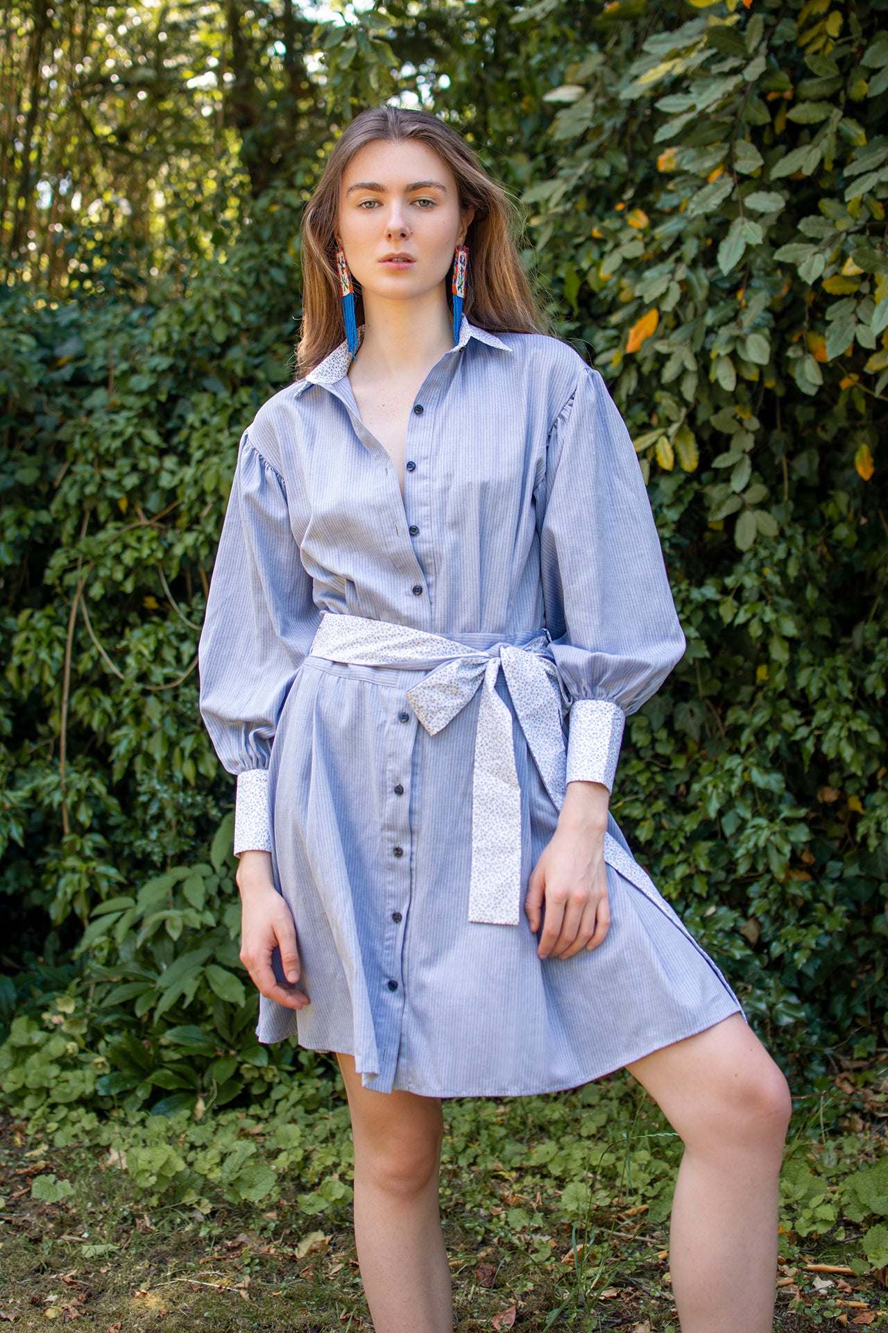 A button down dress featuring a feminine waisted silhouette, exaggerated sleeves and a waist tie.