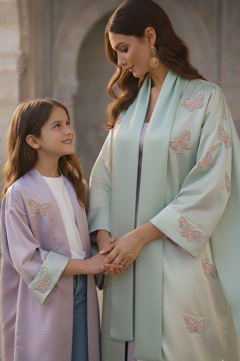 Crafted from satin with a structured, fluid drape, this reversible robe offers two refined looks in one. Delicate hand beaded embroidered butterfly motifs are scattered across the outer layer, while the contrasting reverse side reveals a softer lilac tonal story, visible through movement and styling.