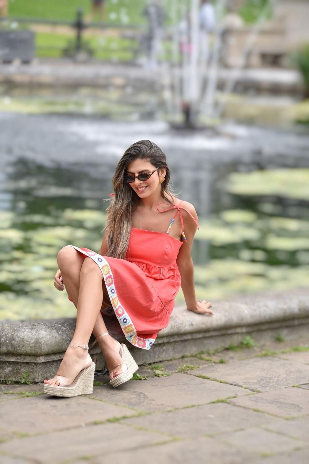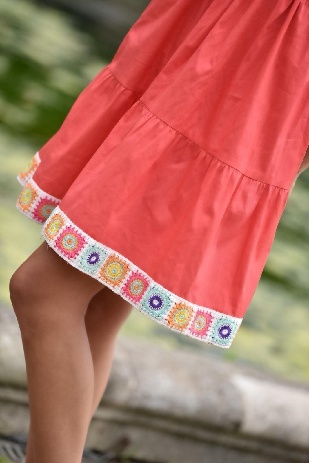 Poplin tiered dress with a colourful crochet hem and tie straps.