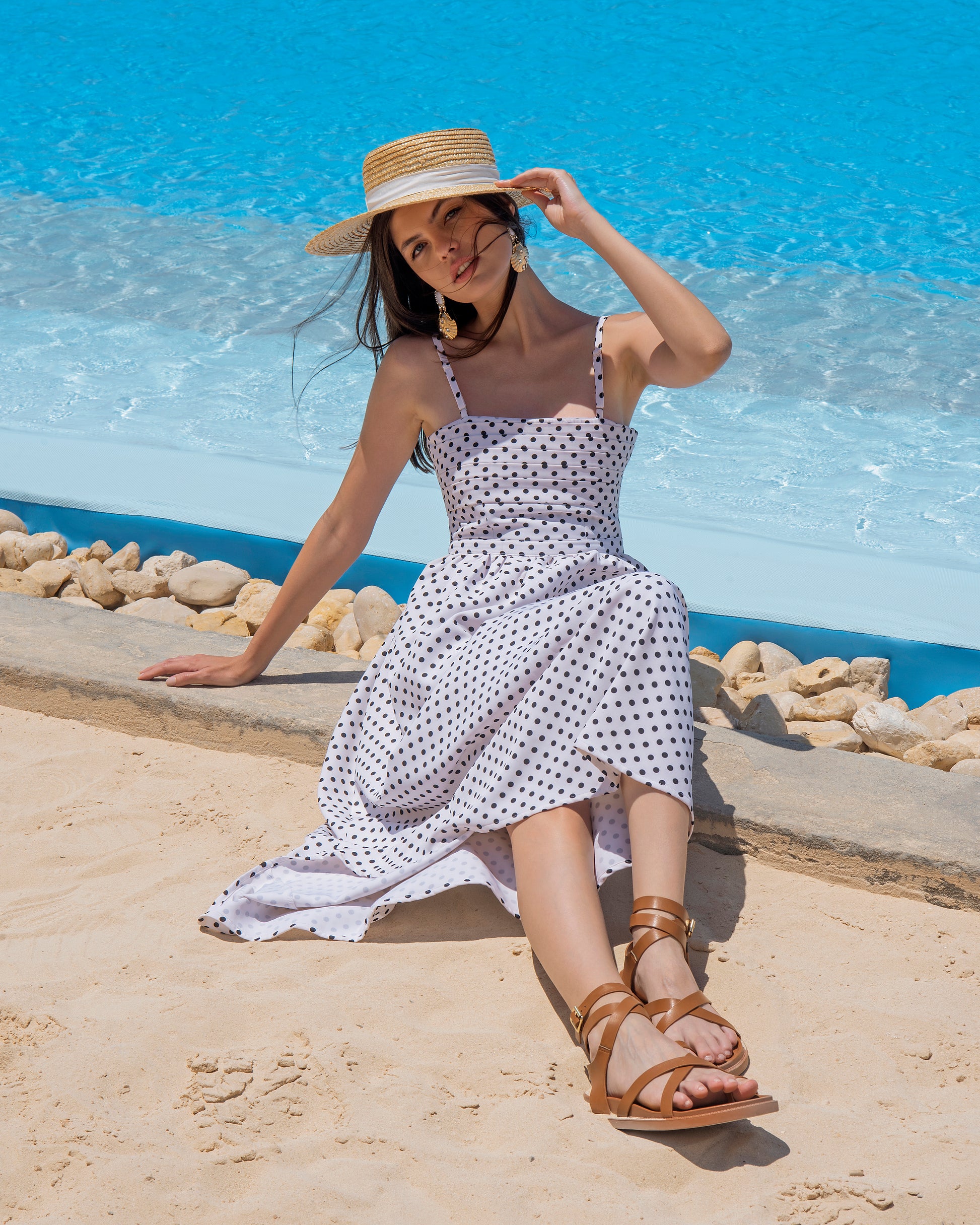 The Kate is a fit and flare maxi dress, in the most classic romantic of prints, the polka dot. This dotty number is fitted at the waist with a full skirt, creating a very flattering silhouette.