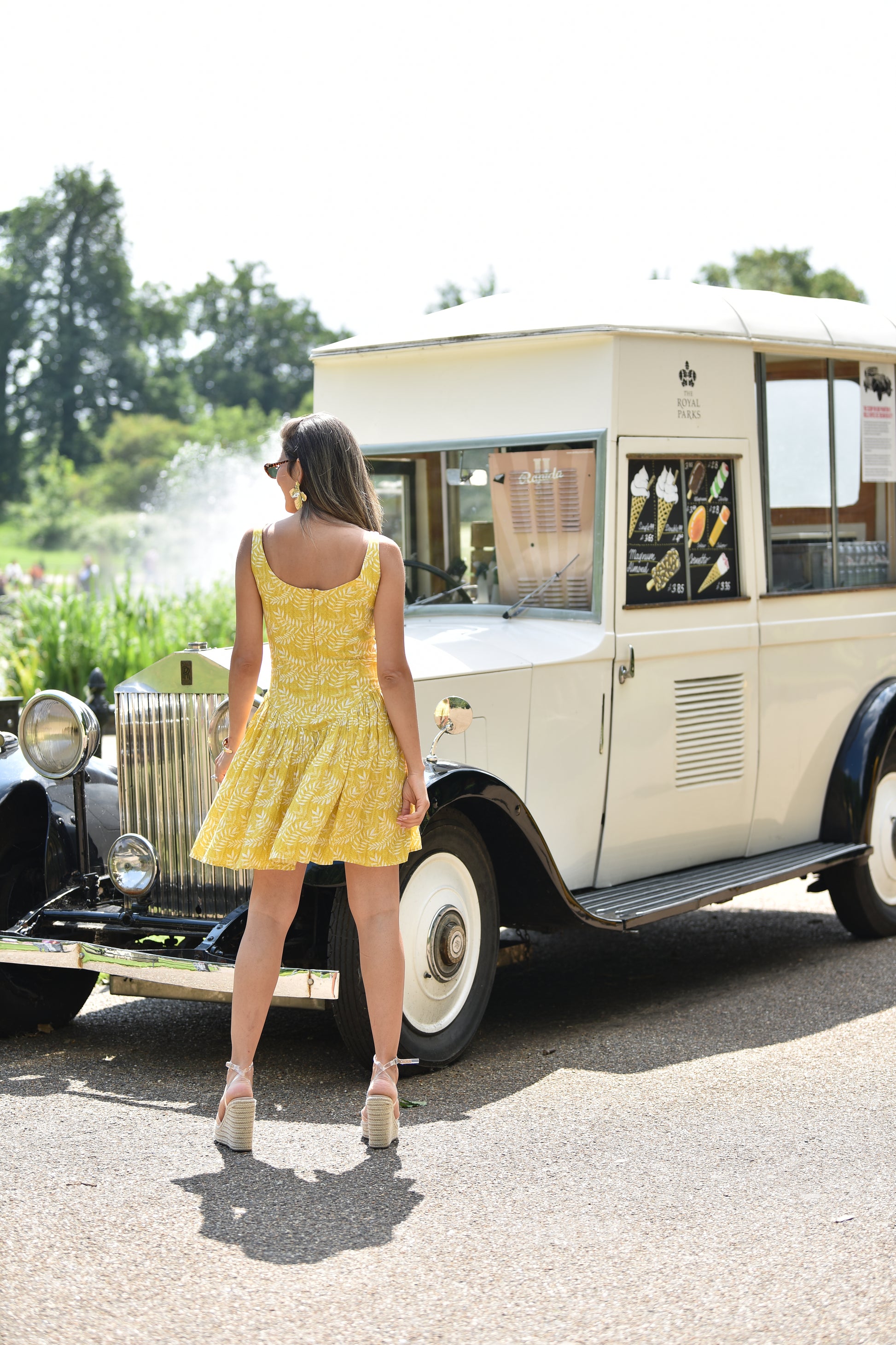 Its corset style top and flirty skirt in this light breezy fabric, makes this dress a summer winner!