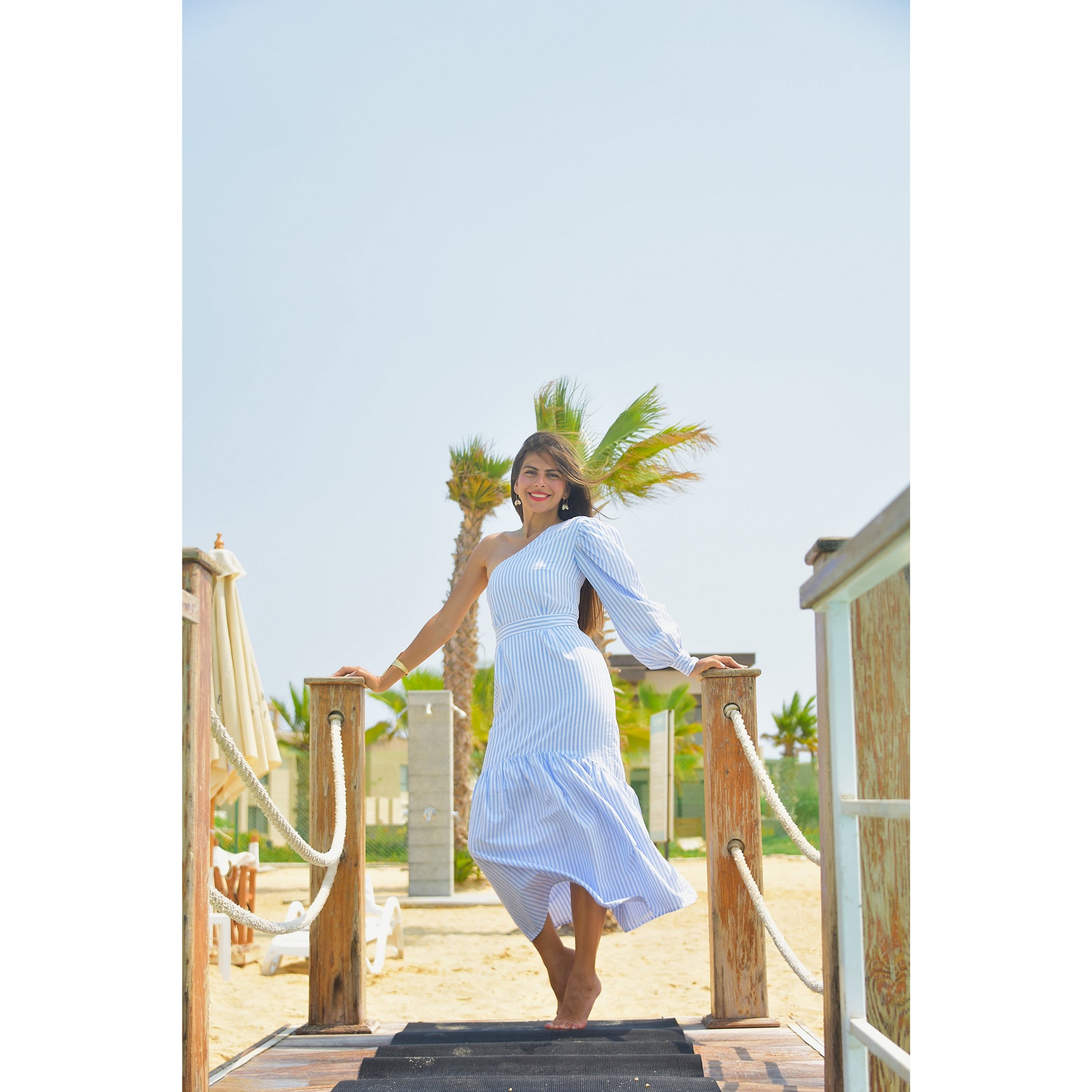Featuring one puff shoulder, this dress is made of a cotton blend fabric. Lined, so no worries about sheerness.