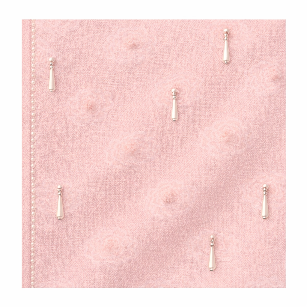 This ivory open-front kimono is crafted from a delicately textured fabric, adorned with subtle floral motifs and hand-applied pearl detailing. Fine pearl lines trace the front panels, while elongated pearl accents are scattered throughout, catching the light with every movement.