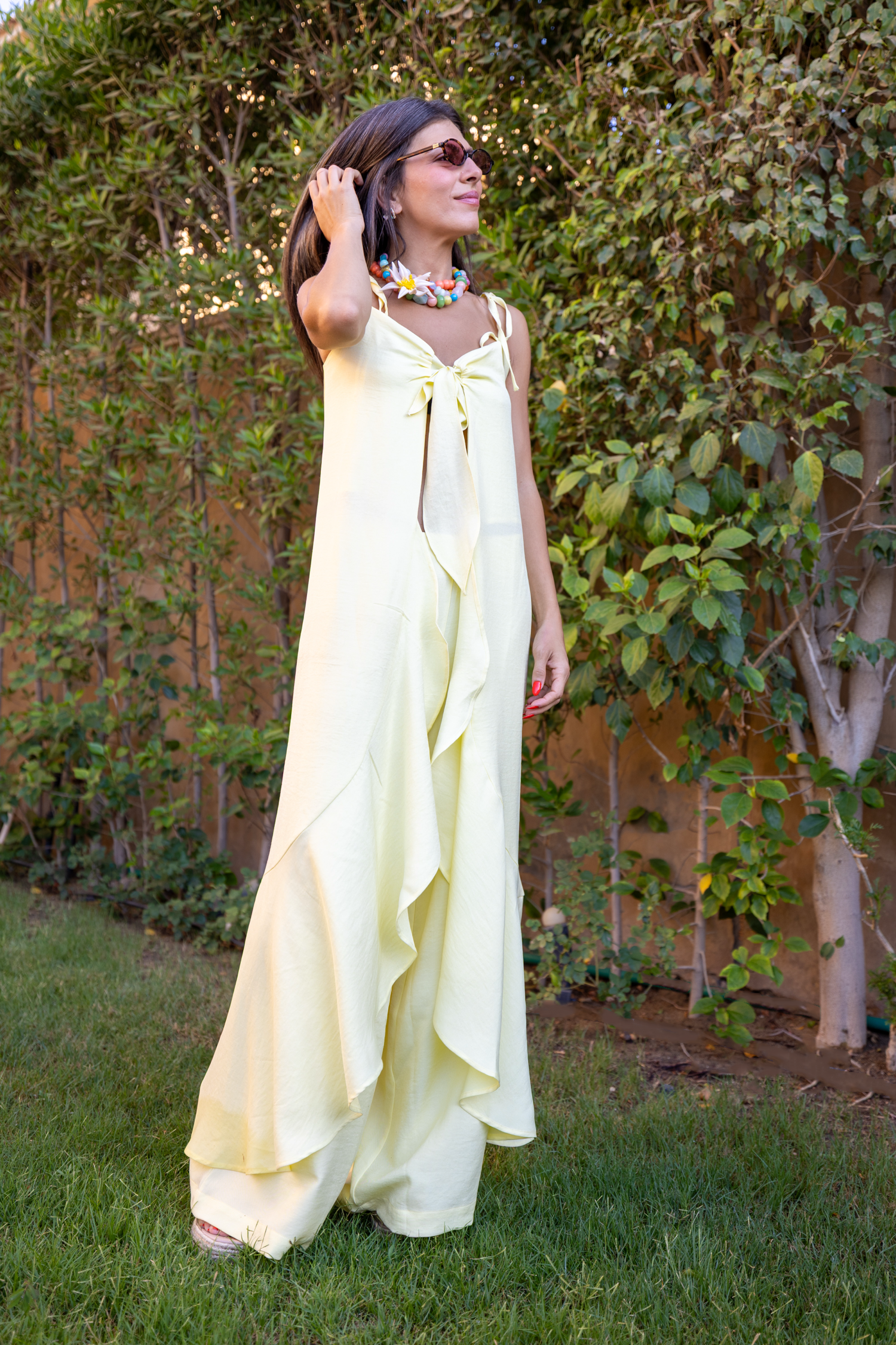 A set featuring a pair of wide leg trousers with concealed side zipper and a long top with a tie front and ruffle.