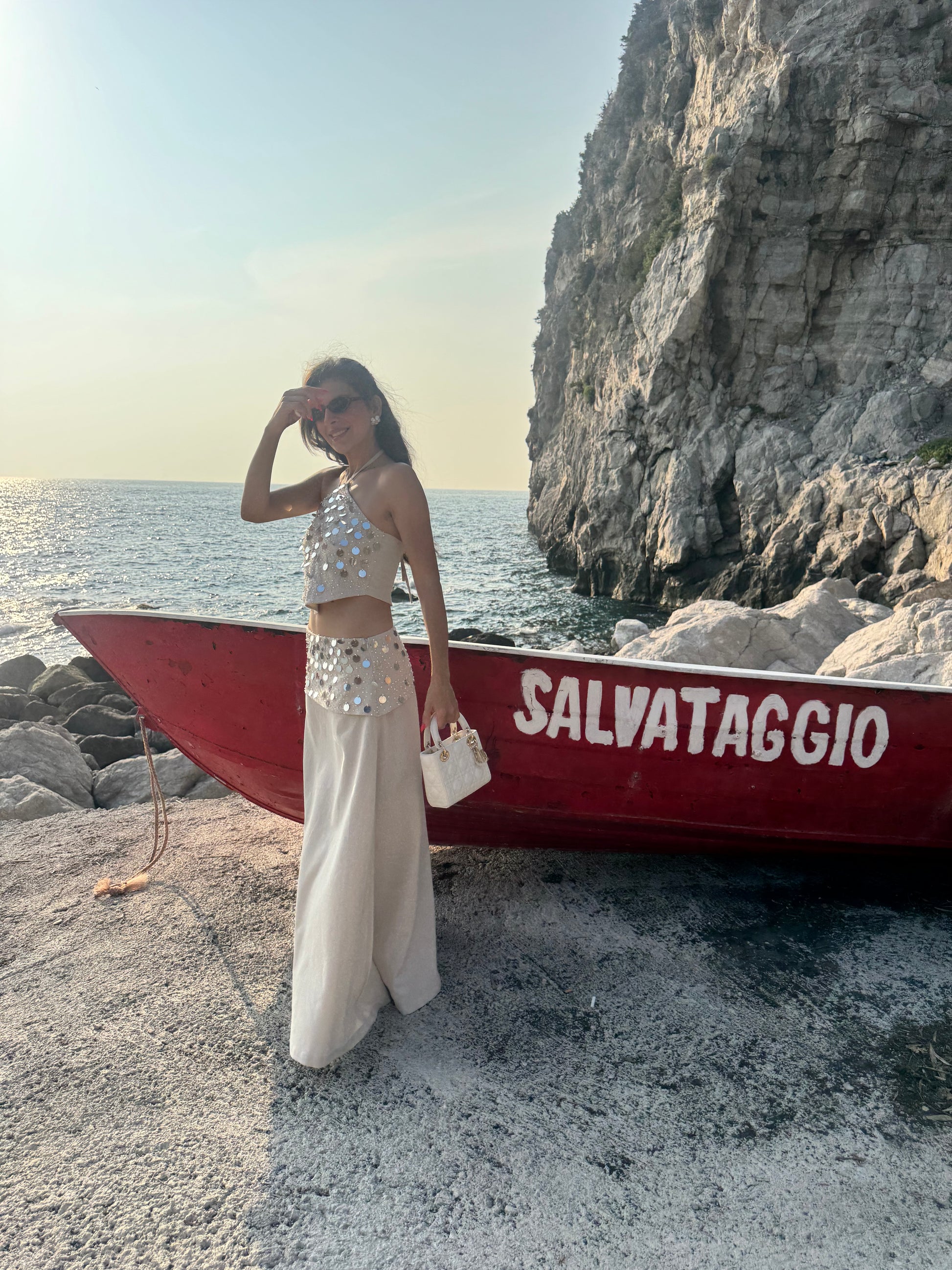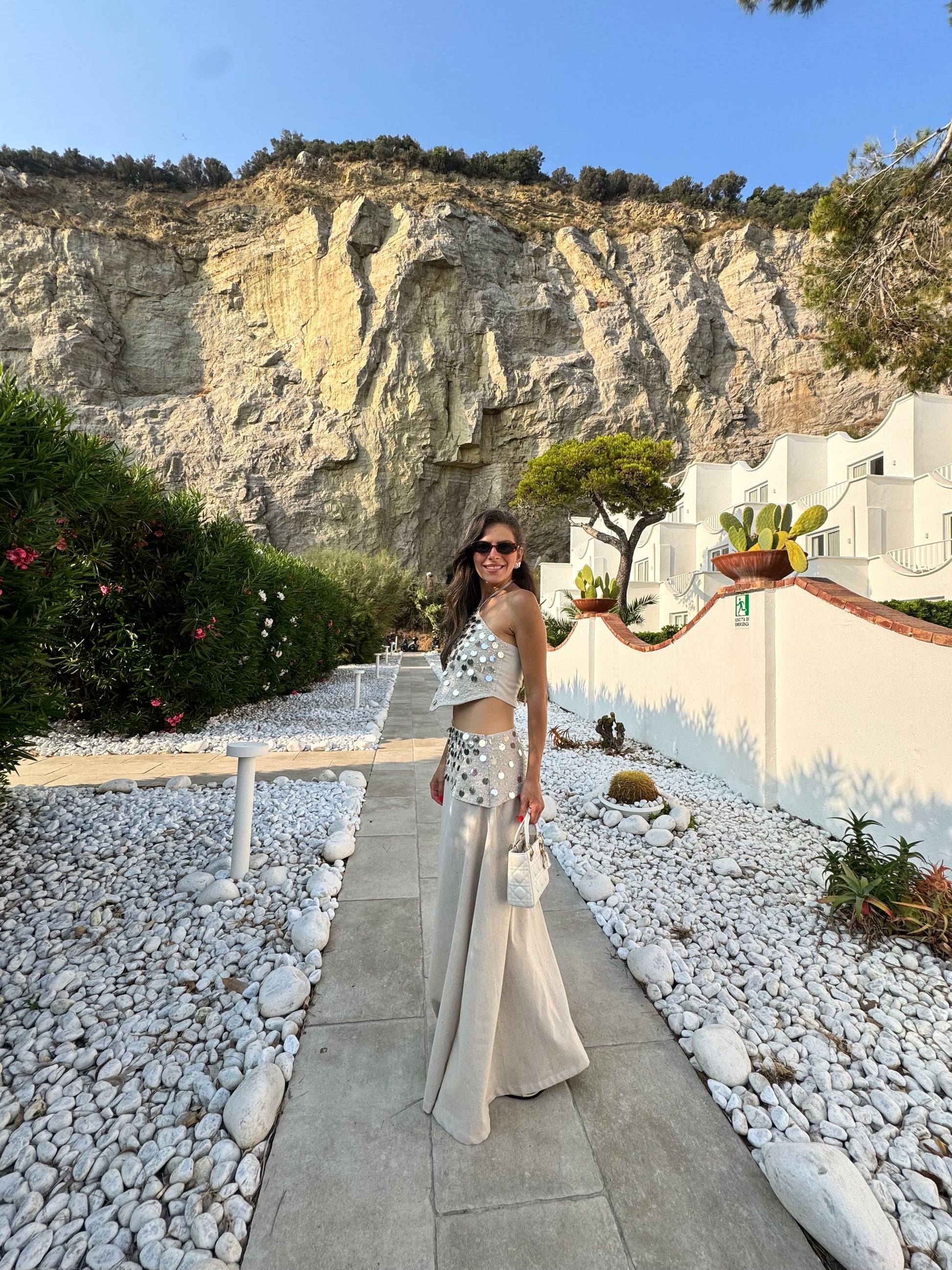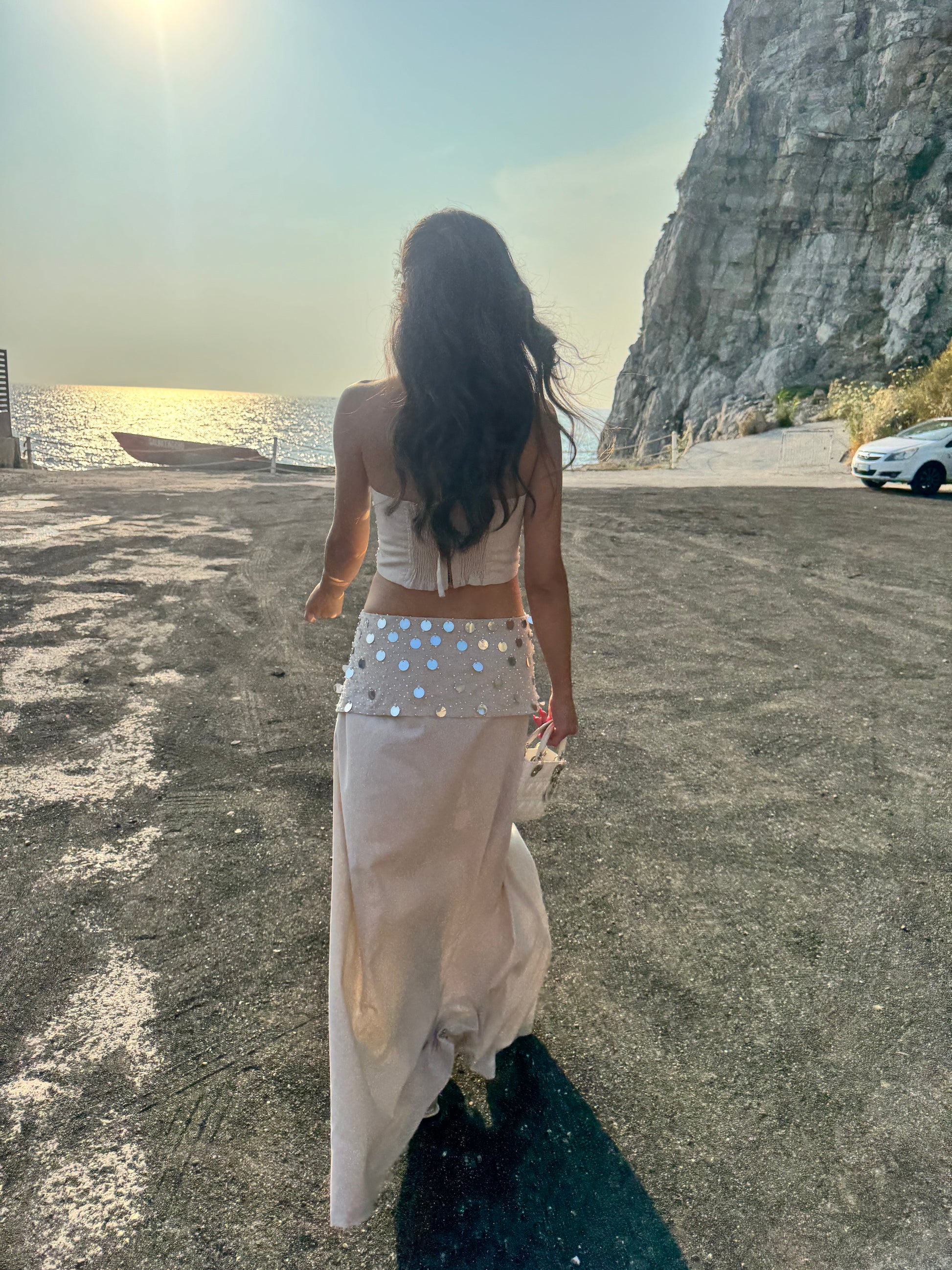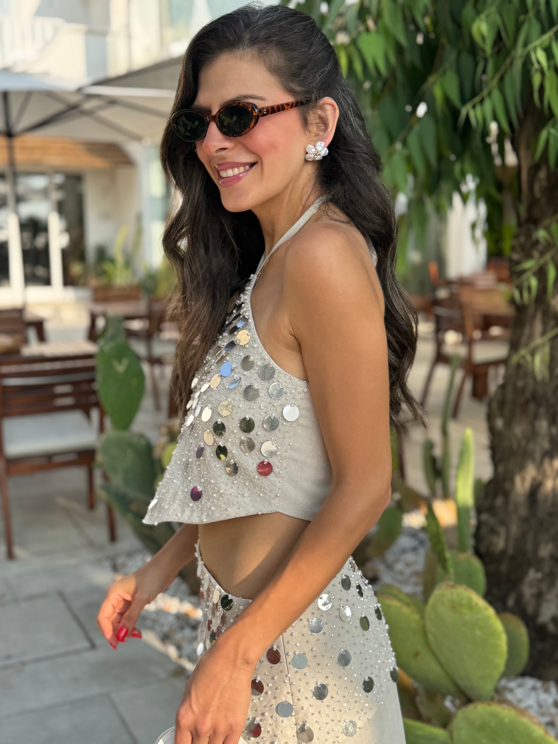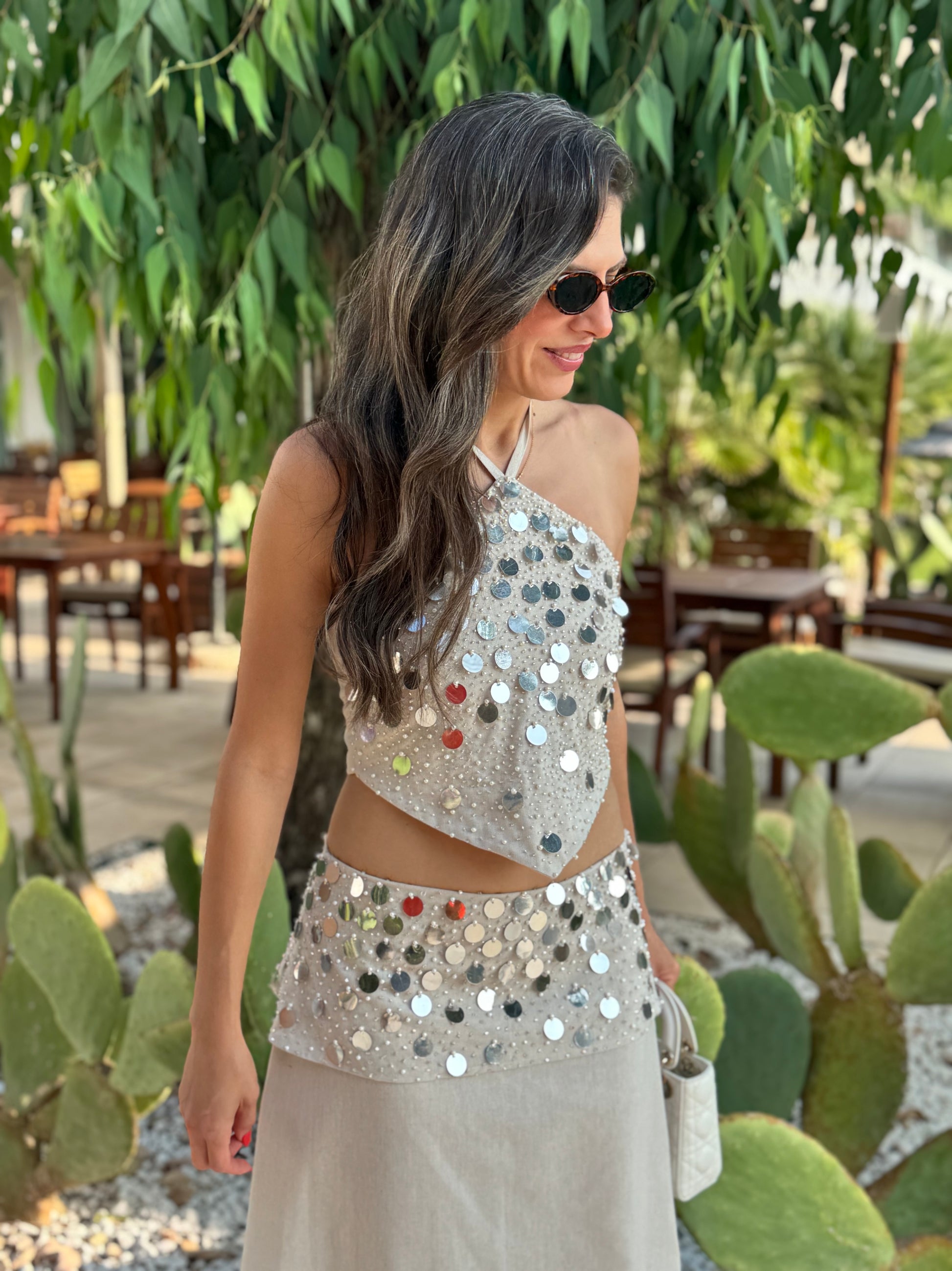 A stunning set of disco sundaZe dreams. Crafted out of premium linen and hand embellished in pearls and mirror sequins. Featuring a halter top with an elasticated back for a comfortable fit, and a maxi low waisted skirt in a very flattering cut and a fold over hand embellished yoke.