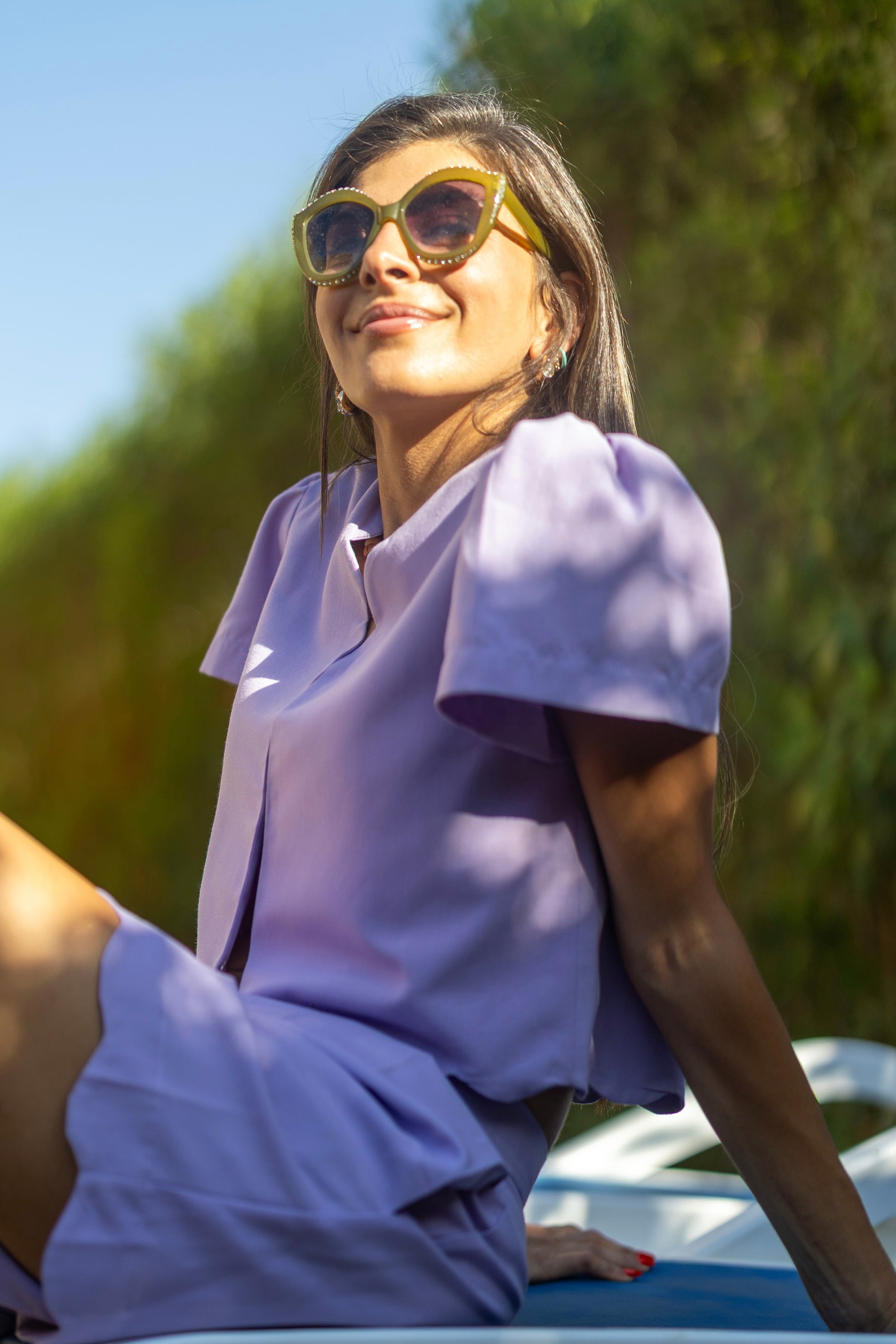 A shorts set in premium linen featuring scalloped hem shorts and a beautifully crafted top with a puff sleeve and hook and eye closures.