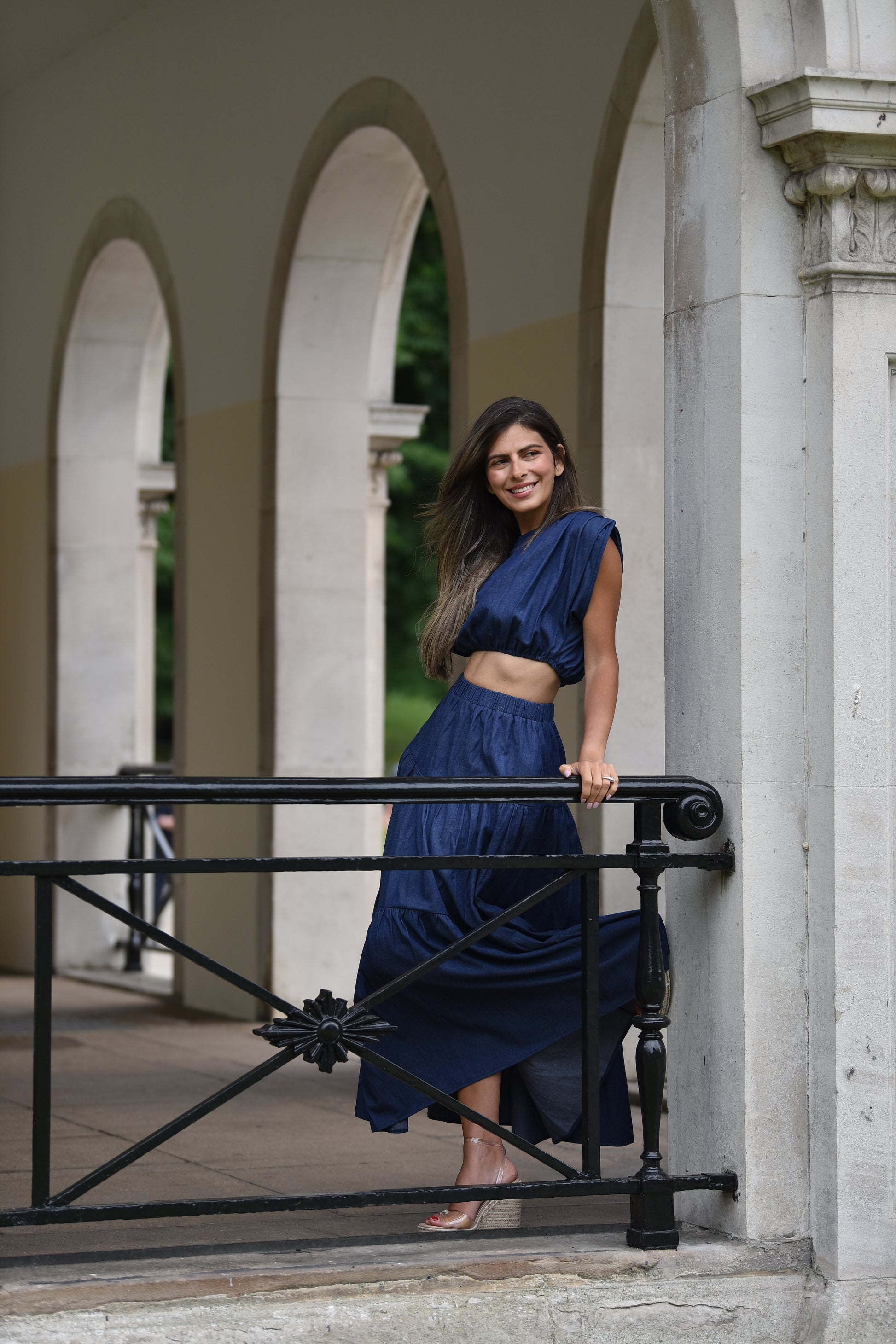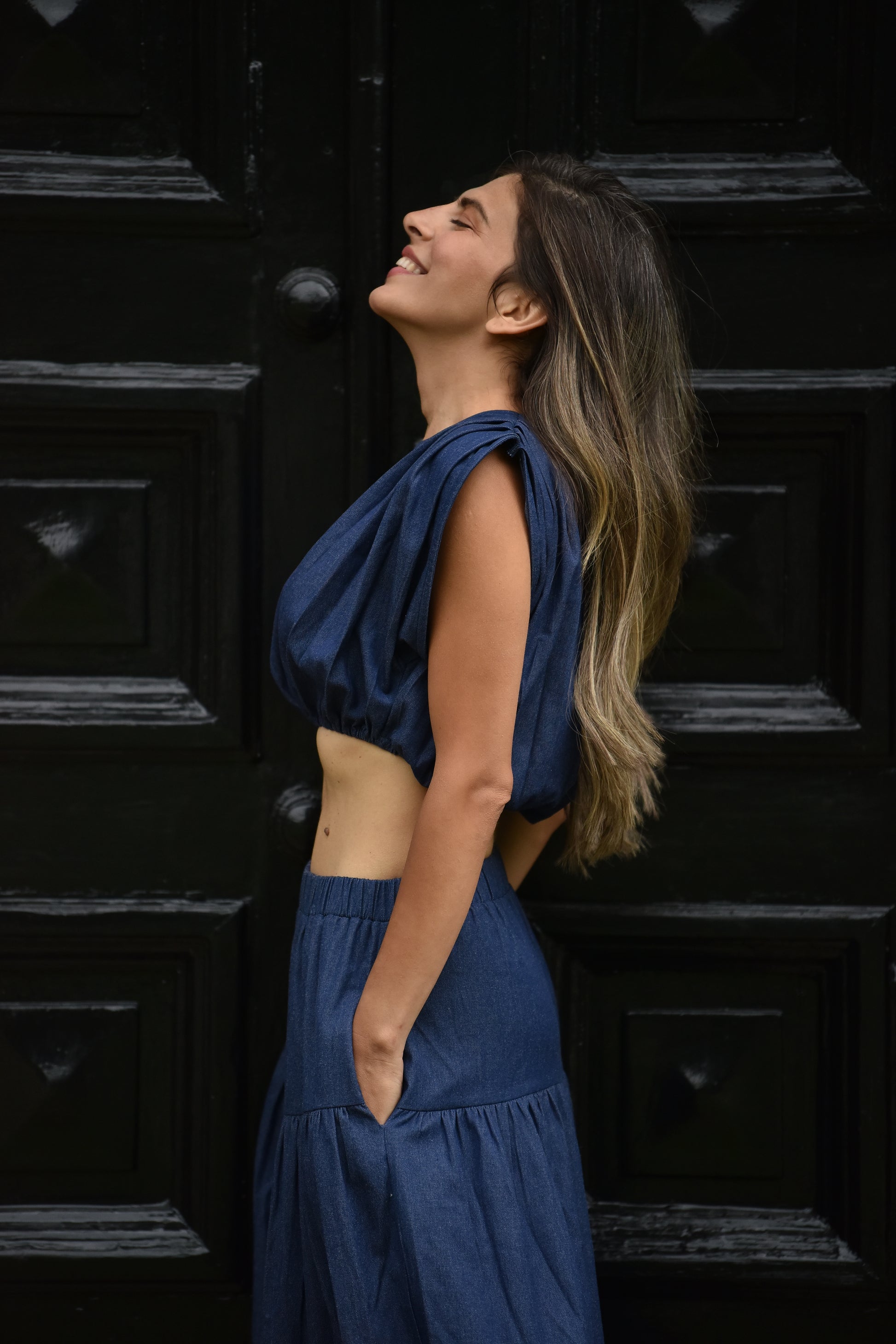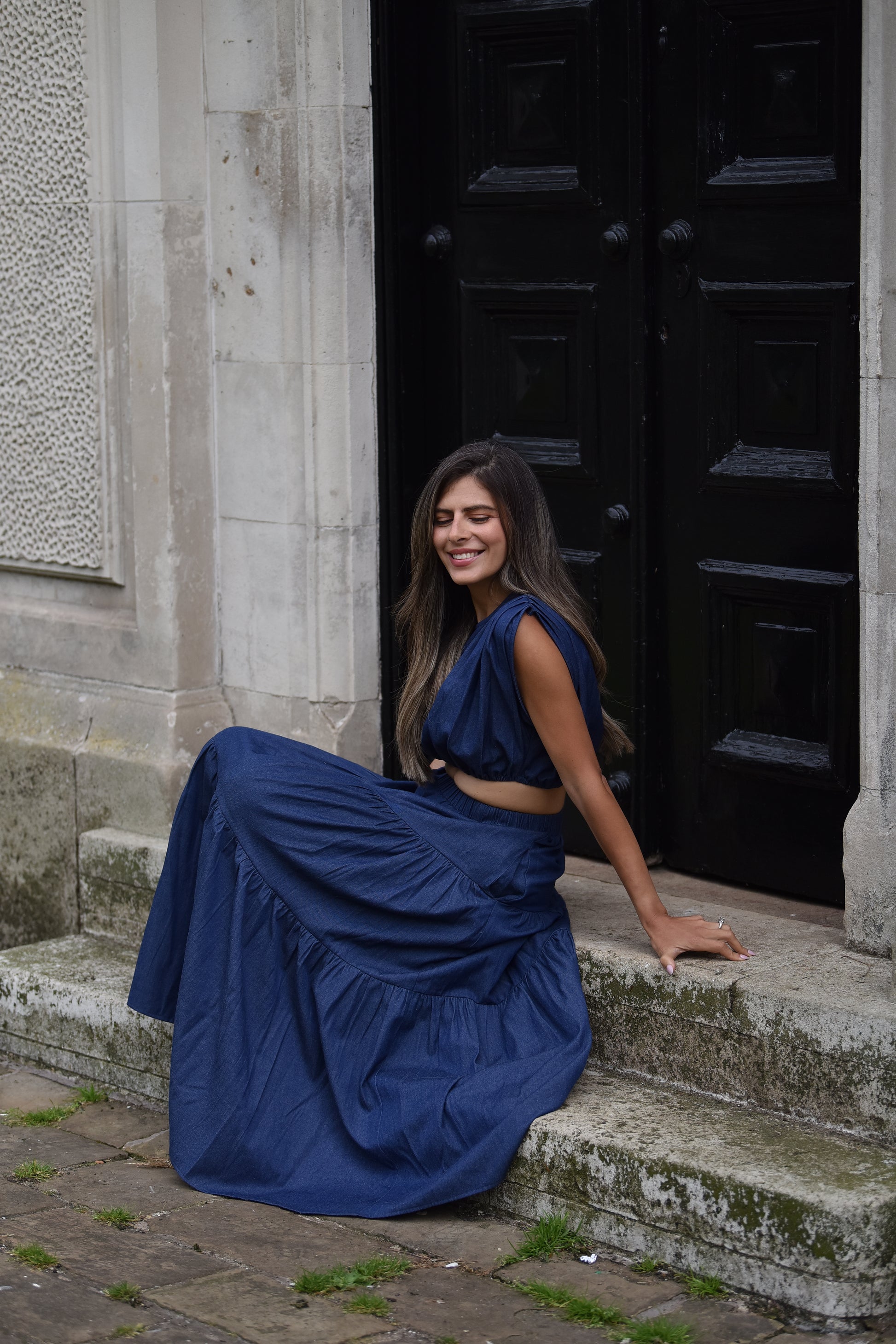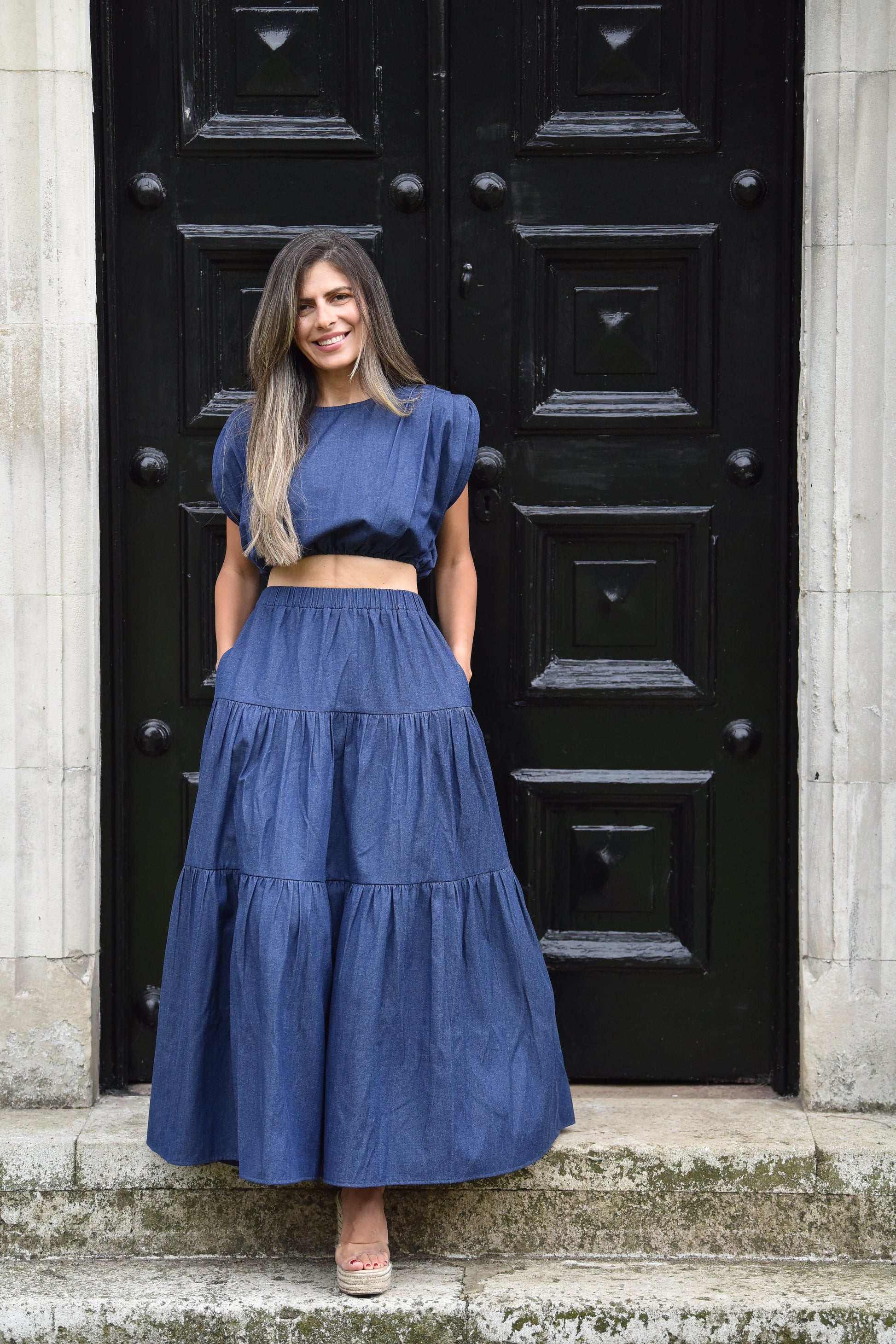 Dark blue denim coord featuring a cropped top with pleated details on shoulders and elasticated hem, and a coordinating elasticated waist; tiered maxi skirt.