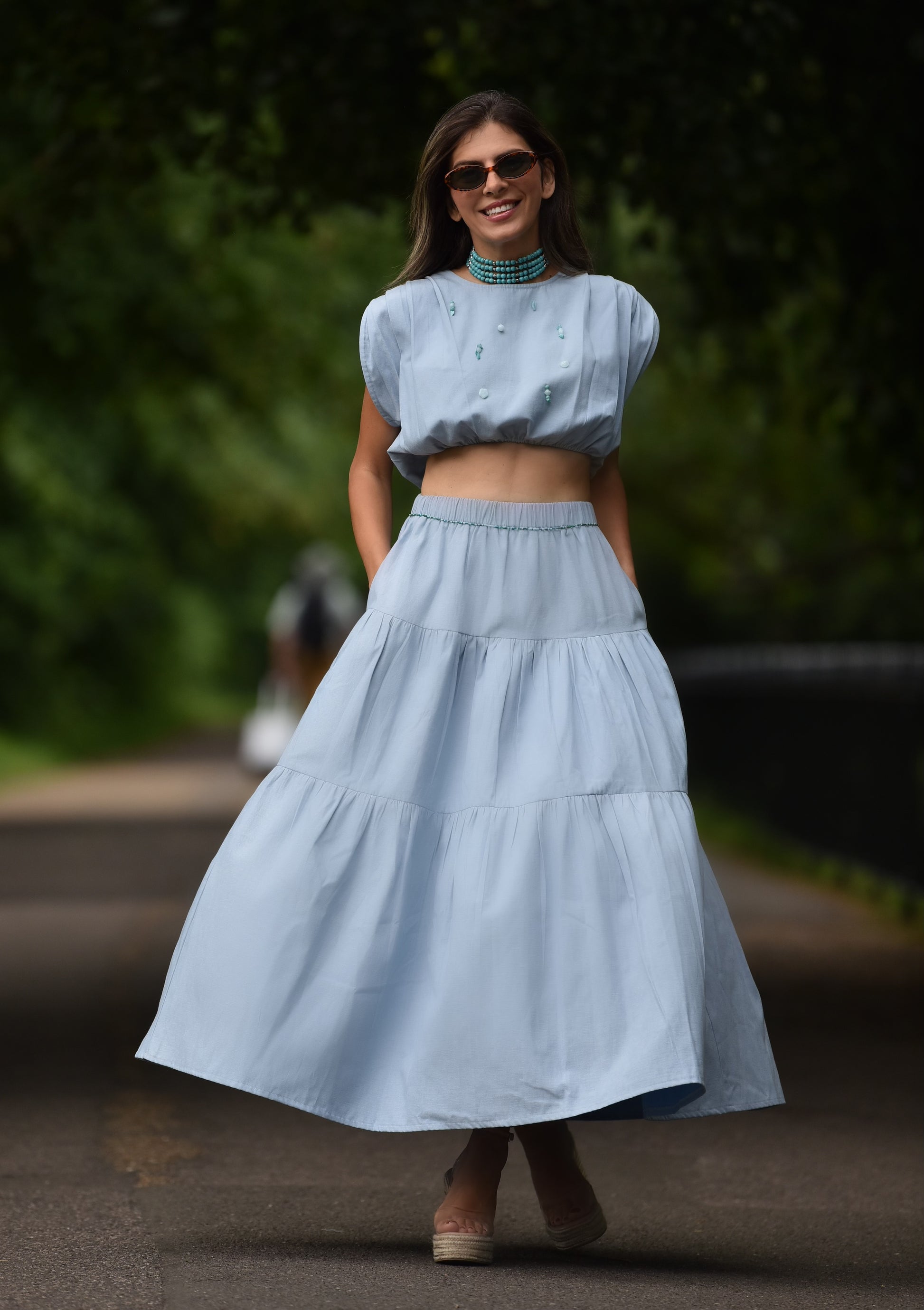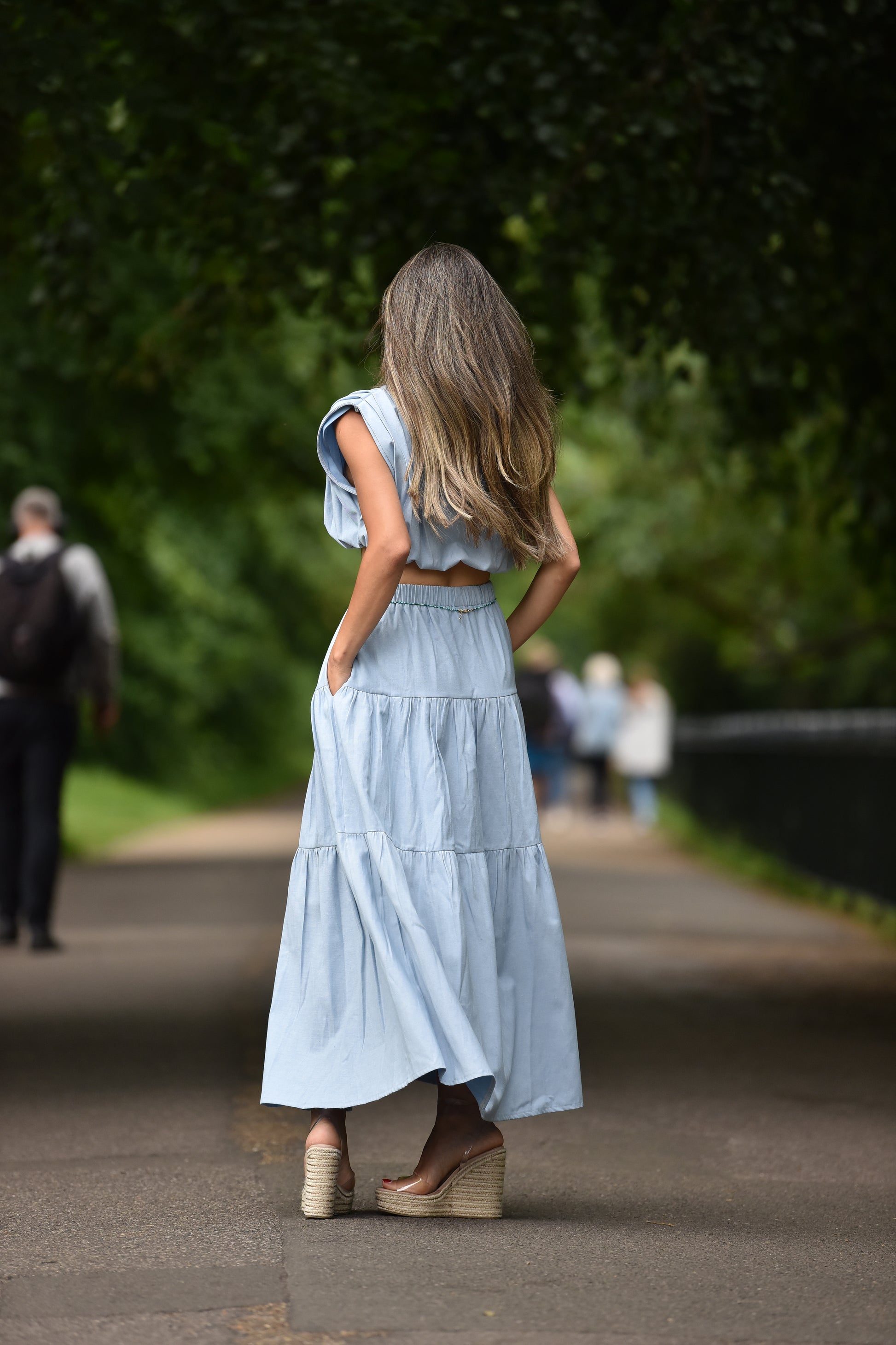 Light blue denim coord featuring a cropped top with pleated details on shoulders and elasticated hem, and a coordinating elasticated waist; tiered maxi skirt.