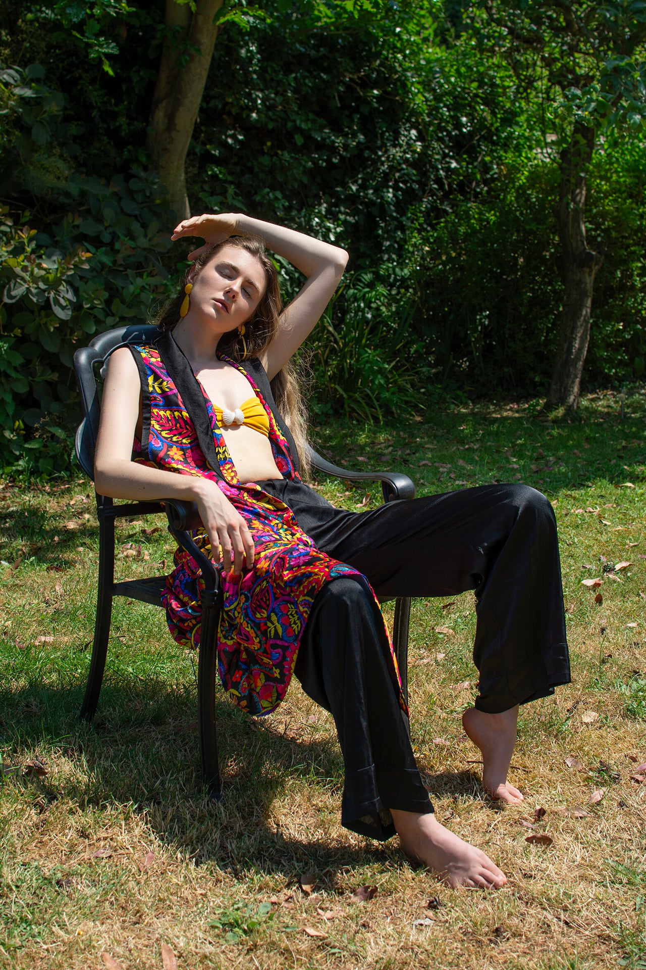 Printed long kimono in black contrasting lapel and shoulder trim.